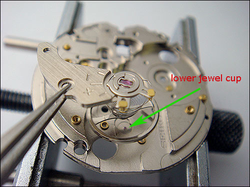 By holding the balance wheel cock as shown, insert the bottom pivot into lower jewel.